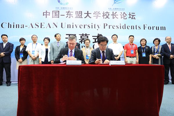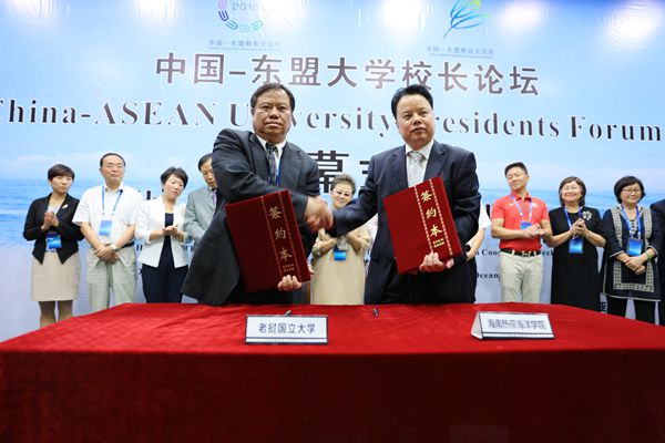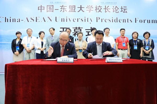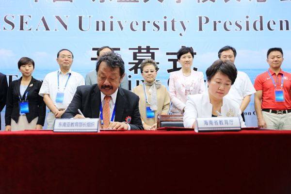 开幕式上,海南省教育厅与东南亚教育部长组织签订促进教育合作与交流备忘录;中国-东盟教育培训联盟与泰国斯坦福国际大学签订合作协议;中国-东盟教育培训联盟与马来西亚英迪国际大学签订合作协议;我校与欧盟中国城市发展委员会签订合作备忘录、与老挝国立大学签订合作备忘录。校党委书记韦勇主持签约仪式。